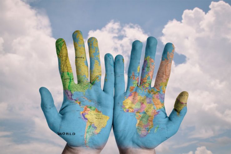 zwei handflaechen mit weltkarte bemalt, vor wolkigem himmel