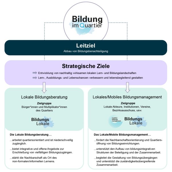 „Bildung im Quartier“ verbindet Aufgaben des Lokalen Bildungsmanagements und der Lokalen Bildungsberatung. Dazu werden in ausgewählten Stadtquartieren BildungsLokale eingerichtet.