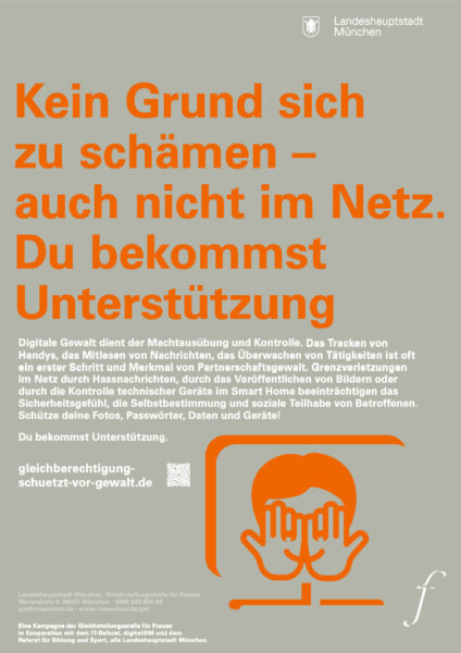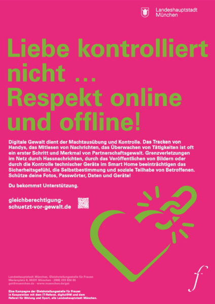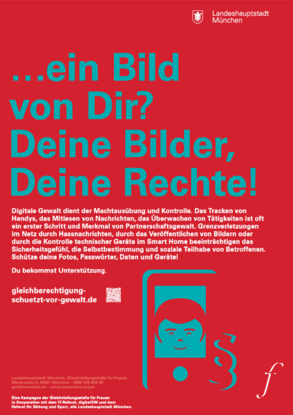 Im Juli 2025 hat die Gleichstellungsstelle für Frauen der Stadt München eine Kampagne zum Schutz vor digitaler Gewalt veröffentlicht. Sie umfasst Plakate und Postkarten mit vier verschiedenen Motiven und Sprüchen. Die Kampagne ist Teil der Umsetzung des Münchner Aktionsplans gegen geschlechtsspezifische Gewalt. Weitere Informationen dazu finden sich auf der Website “Gleichberechtigung schützt vor Gewalt” der Gleichstellungsstelle für Frauen. Bezugnehmend auf diese Kampagne haben wir Unterrichtsmaterialien sowie Unterstützungs- und Beratungsangebote für Jugendliche und Lehrkräfte zusammengestellt.