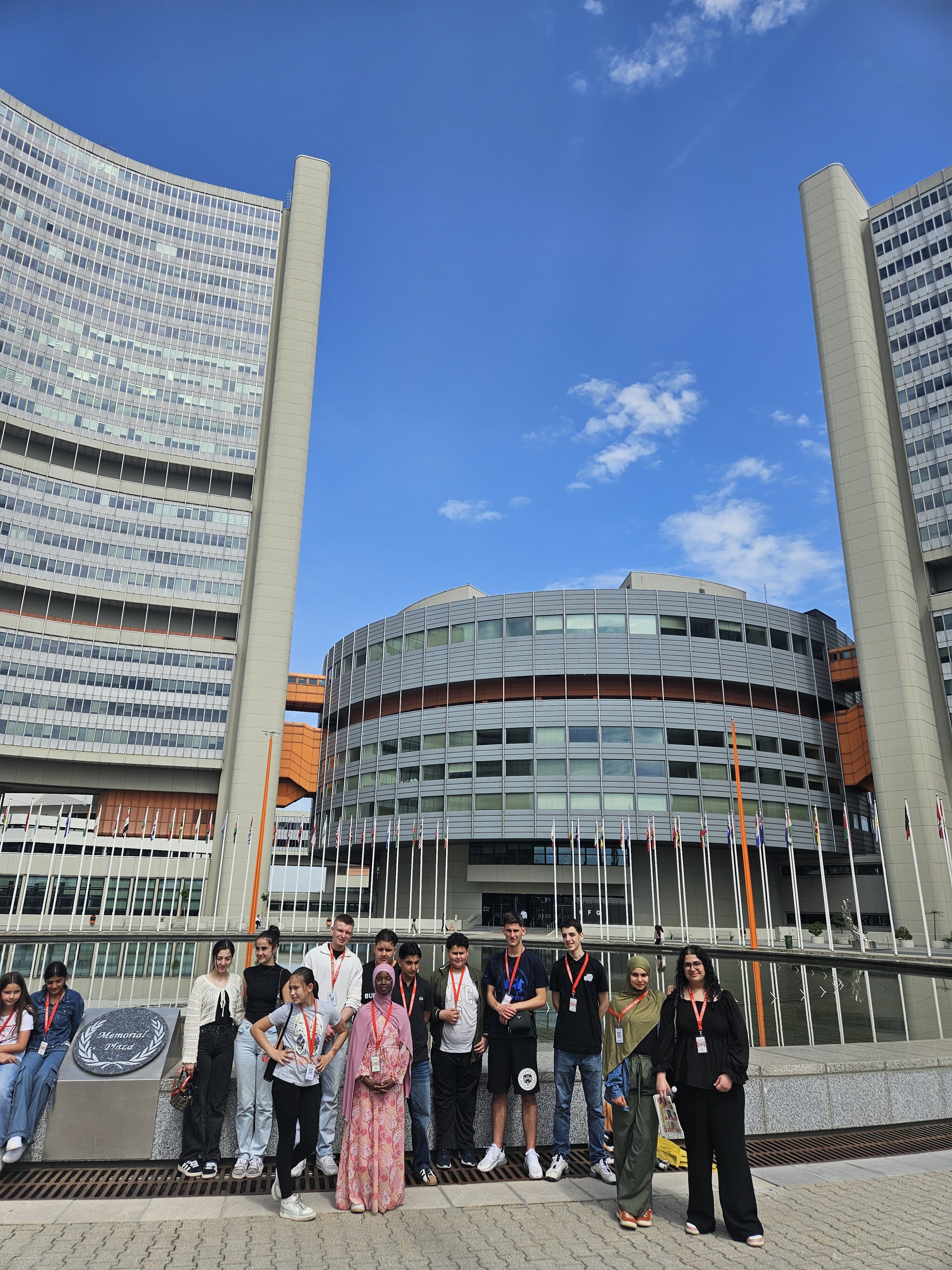 Der zweite Tag, Montag, der 2. Juni 2025, stand ganz im Zeichen des internationalen Austauschs und der politischen Bildung. Die Gruppe traf sich mit Schülern der (Wiener) Dominikanerschule an der UNO City in Wien. Es folgte eine beeindruckende und sehr informative Führung durch das Gebäude der Vereinten Nationen. Den Schülern wurden der Zweck und der Aufbau der UNO detailliert erläutert, und sie erhielten Einblicke in die zahlreichen Fachsymposien, die dort jährlich stattfinden. Besonders beeindruckt waren die Schüler von ihrem Guide, der sieben Sprachen fließend beherrschte.